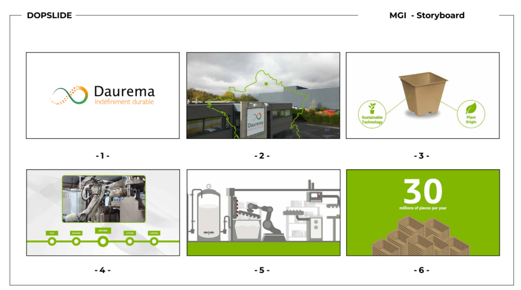 Daurema est un fabricant français spécialisé dans les emballages en cellulose moulée. L’entreprise souhaitait une vidéo institutionnelle moderne et pédagogique pour mettre en valeur son savoir-faire, son usine de Wattrelos, ainsi que les avantages de son godet en cellulose. La vidéo était destinée à leur site web et aux salons professionnels de novembre et janvier.